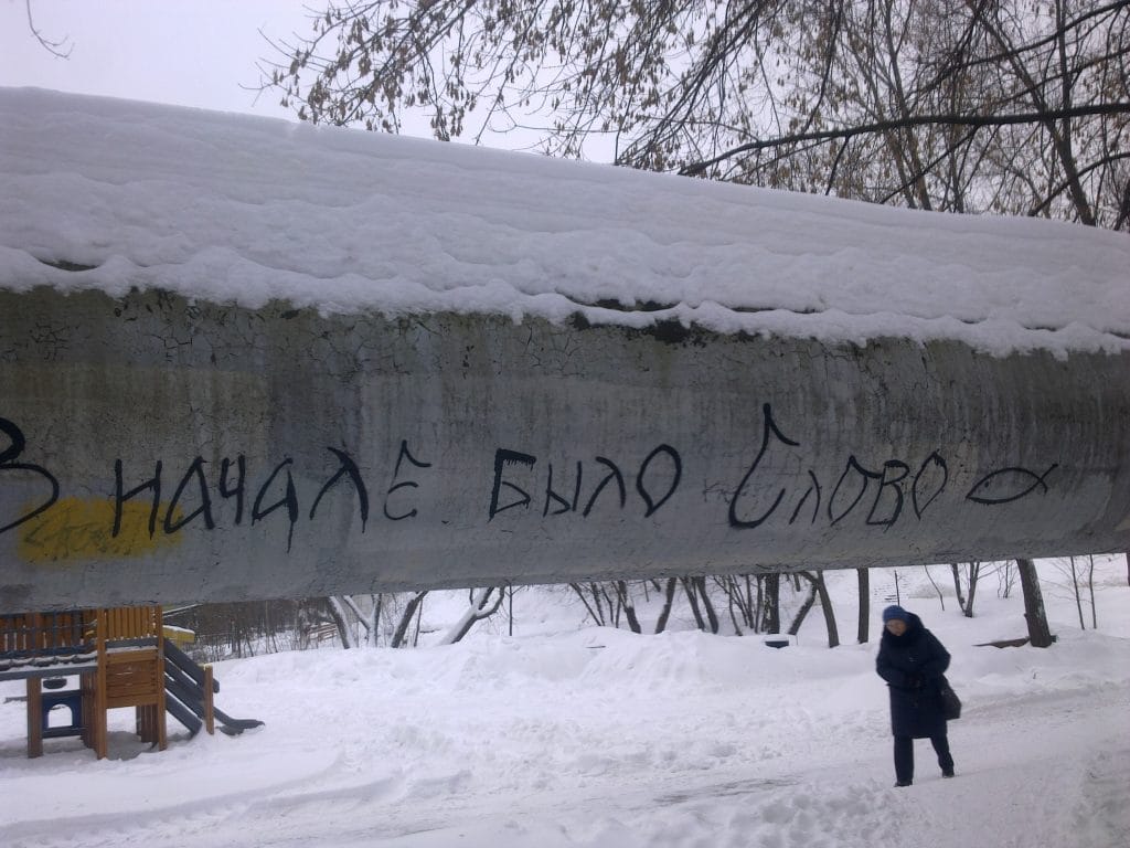 Вот фотография, которую я сделал на берегах Яузы, в московском районе Отрадное. Это – трубопровод через реку. И на нем начертано…