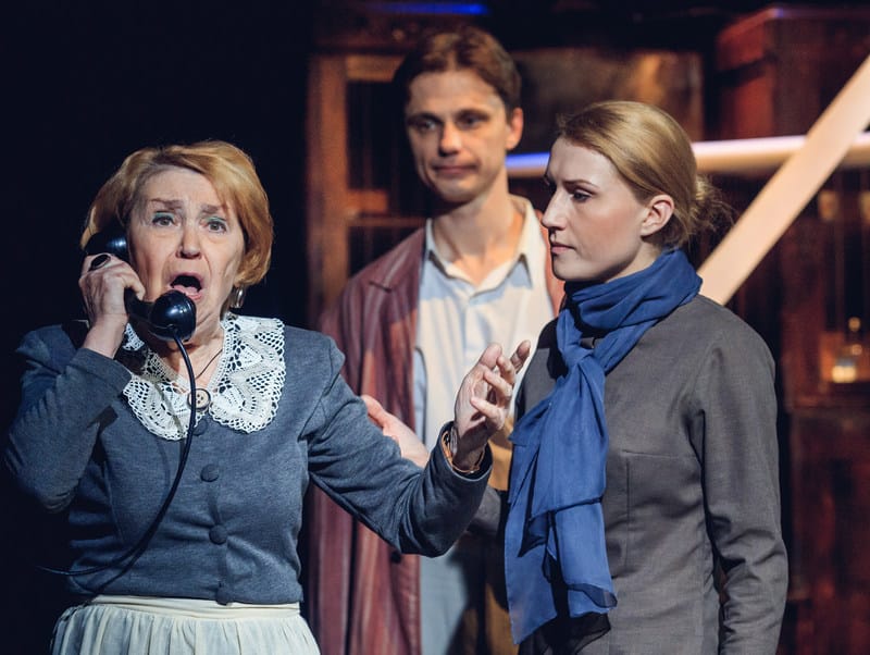 Длинные белые канаты прорезают пространство снизу-вверх, крест-накрест, символизируя лучи прожекторов, освещающих ночное небо над городом, ищущие в нем вражеские самолеты. Война зависает над черной коробкой сцены, как страшная трагедия. Звучат лживые сводки по радио, уверяющие, что наша армия наступает, хотя при этом мы сдаем один город за другим. Люди рвутся добровольцами на фронт или уходят по призыву. Теплая и милая городская квартира, с красивой мебелью и пианино, чистой накрахмаленной скатертью на столе мгновенно трансформируется в стену железнодорожного вагона, с безликими ящиками вместо стульев, сколоченными из грубых досок. В эвакуации трансформируются и отношения внутри дружной, казалось бы, семьи. Война для всех становится проверкой.