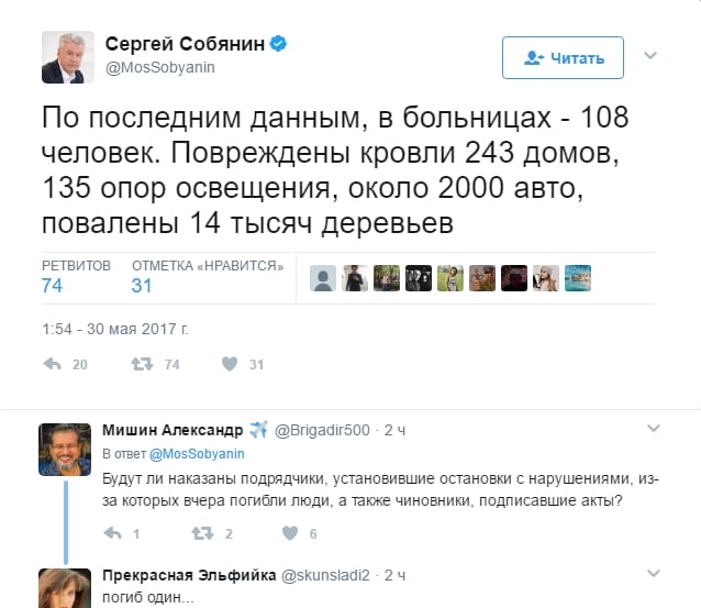 «По последним данным, в больницах находятся 108 человек. Повреждены кровли 243 домов, 135 опор освещения, порядка 2000 автомобилей, повалено 14 тысяч деревьев», – написал мэр в своем твиттере во вторник.