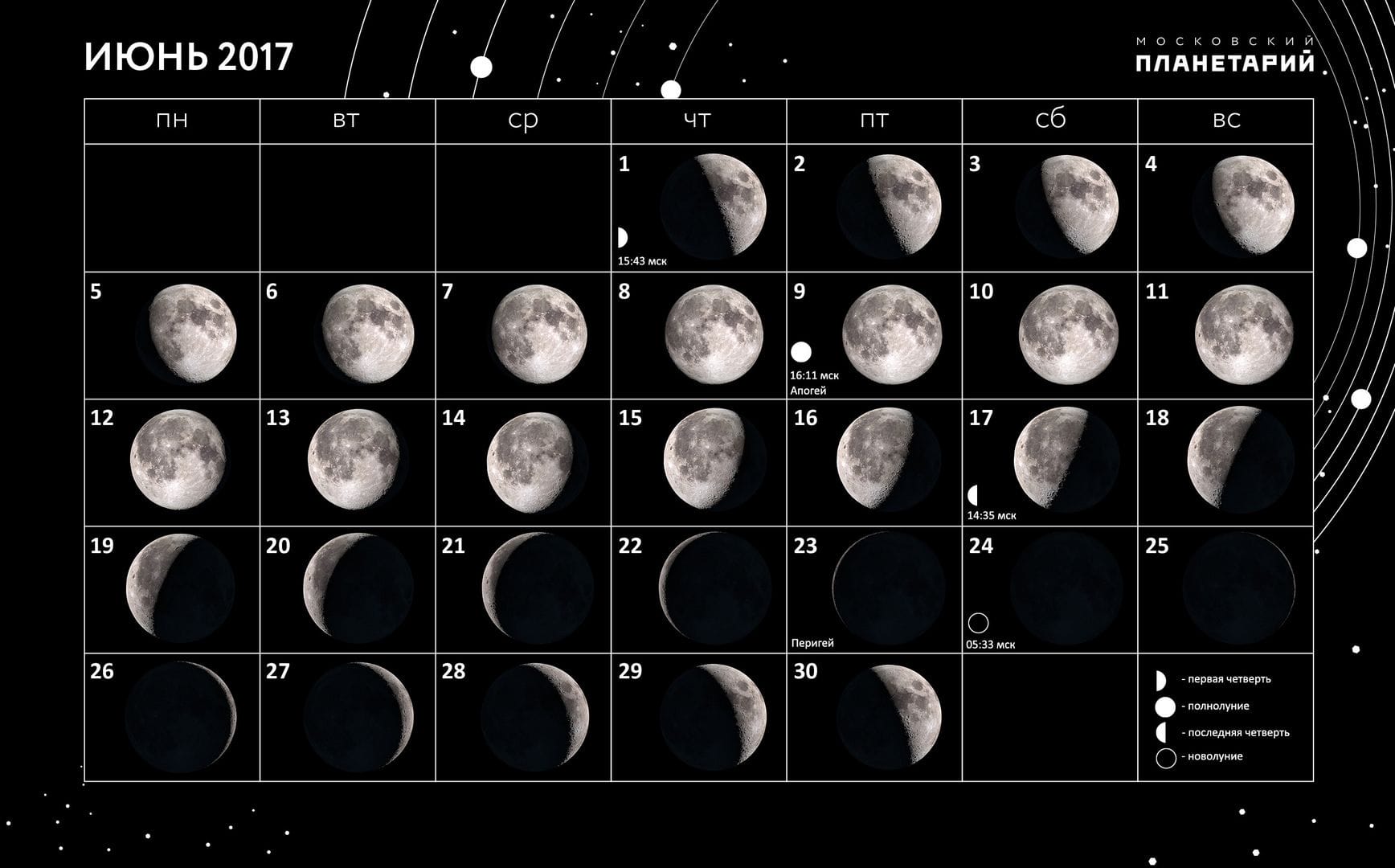 Луна будет видна в июне: 1 – 2 – вечером, 3 – 14 – ночью, 15 – 18 – после полуночи, 19 – 21 – утром, 26 – 30 – вечером.