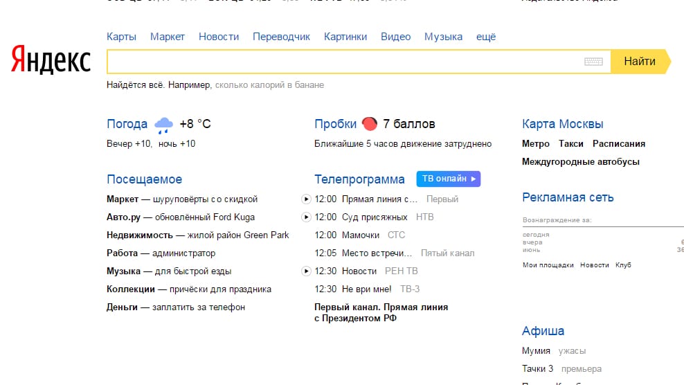 Поисковик “Яндекс” на главной странице очень мило информирует о текущей телепрограмме.