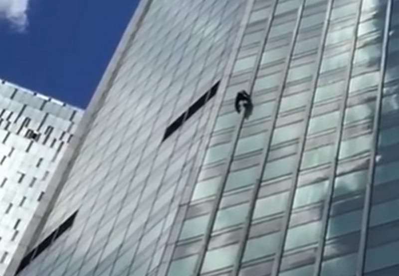 Ранее в сети появилось видео, на котором человек без дополнительной страховки взбирается вверх по стене башни «Евразия», сообщает РИА Новости.