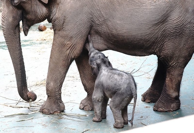 Сейчас большую часть времени новорожденный проводит с матерью, которая кормит его молоком каждые полтора часа. Скоро слоненок начнет пробовать растительную пищу, однако окончательно перейдет на нее лишь к 2-3 годам. Ежедневно взрослое жильное может съедать до 150 килограммов пищи, а главным лакомством азиатских слонов считаются бананы и яблоки. Малыш активный и очень любопытный.