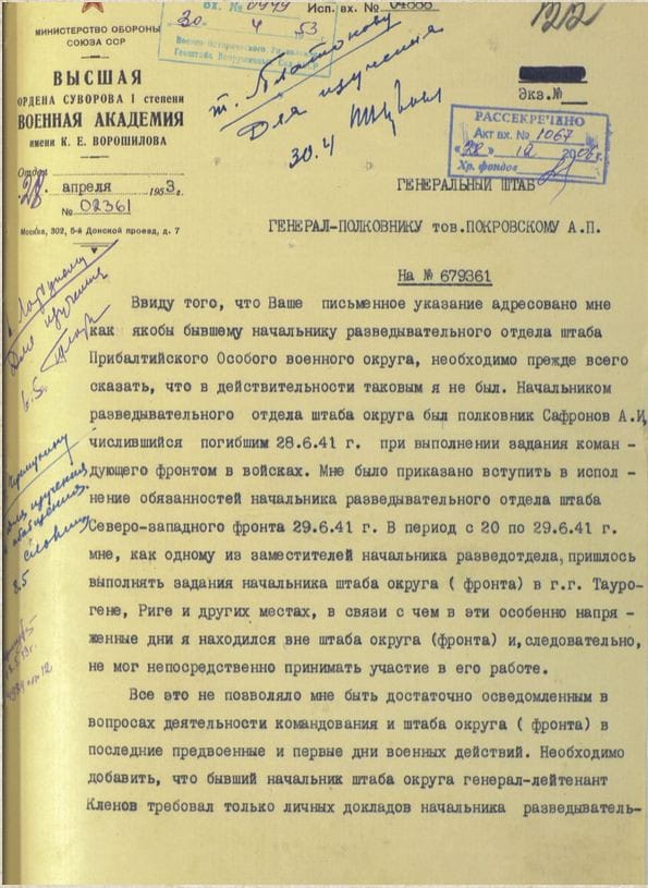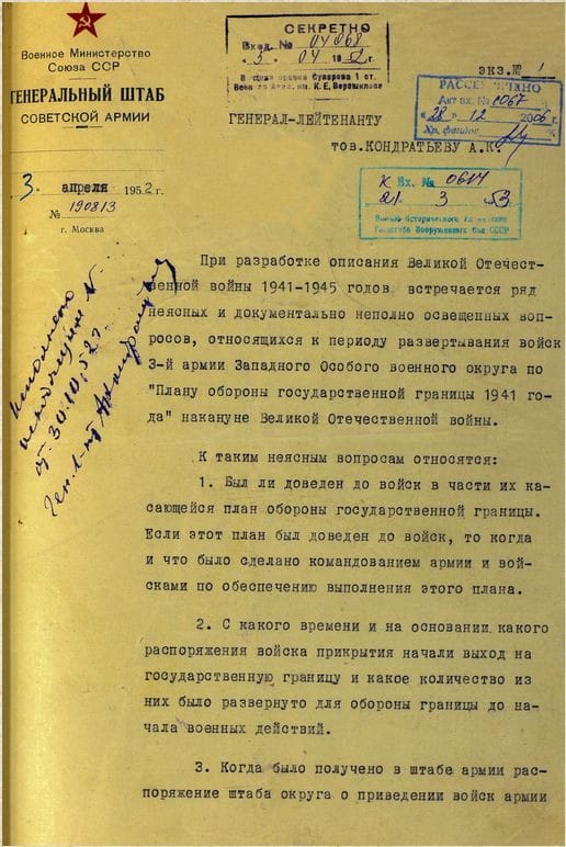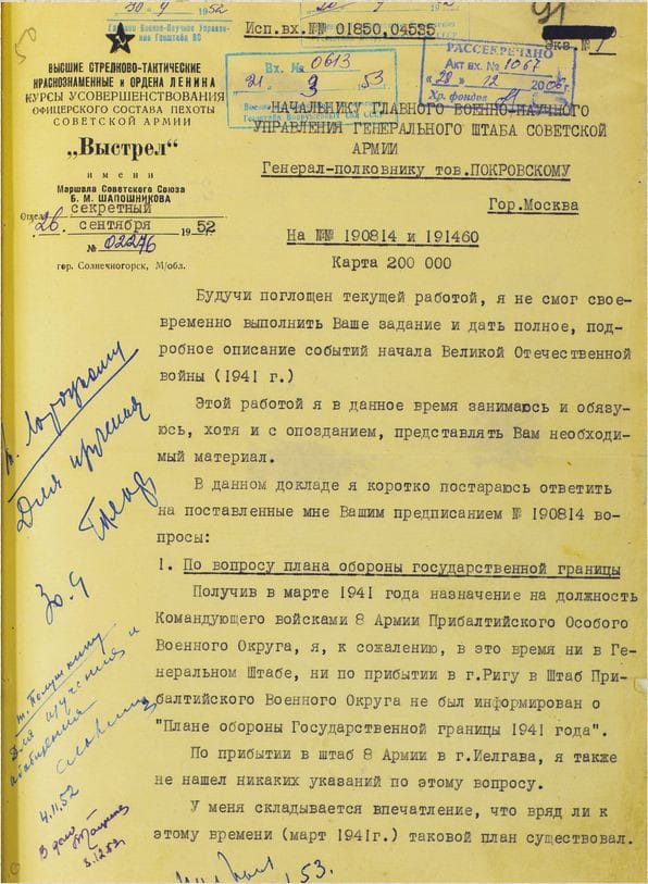 В ответах советских командиров содержится исчерпывающая информация о ходе развертывания войск Прибалтийского, Киевского и Белорусского особых военных округов по «Плану обороны государственной границы 1941 года» и степени готовности оборонительного рубежа по линии государственной границы к началу войны.