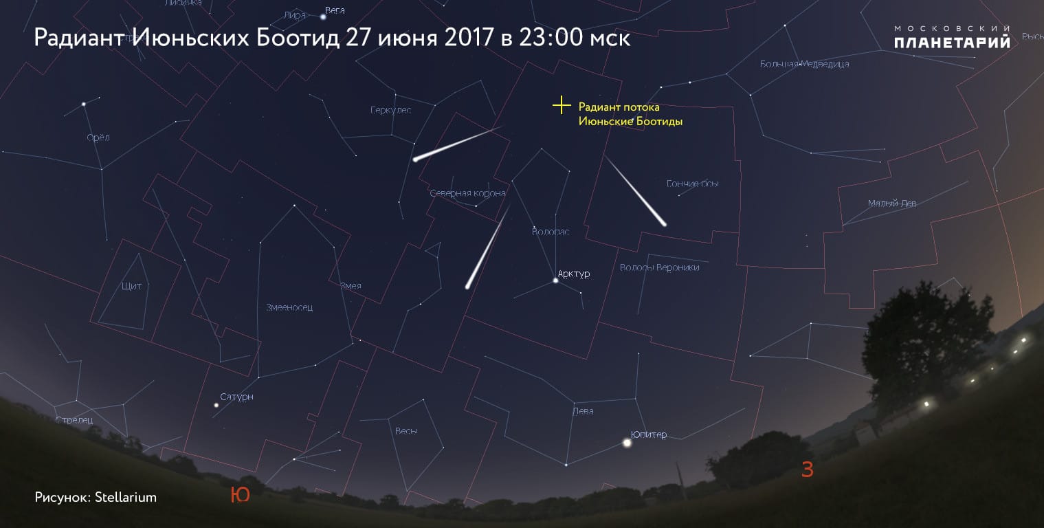 В Московском планетарии рассказали, что наблюдения Июньских Боотид выпадают на самые короткие ночи в году. Чтобы успешно наблюдать «падающие звезды», крайне желательны максимально безоблачное небо и отсутствие лунной подсветки. И хотя Луна, пройдя фазу новолуния 24 июня, не помешает наблюдениям метеоров, уйдя за горизонт сразу после захода Солнца, прогнозы наблюдения метеоров в 2017 году самые печальные – 1 – 2 метеора в час в пик активности 27 июня 2017 года. Радиант Июньских Боотид – то есть точка, откуда, как кажется земному наблюдателю, «вылетают» метеоры, находится в созвездии Волопаса над юго-западной частью горизонта. Так что если запастись терпением и найти удачное место для наблюдений – вполне можно поймать удачу вместе с падающей звездой.