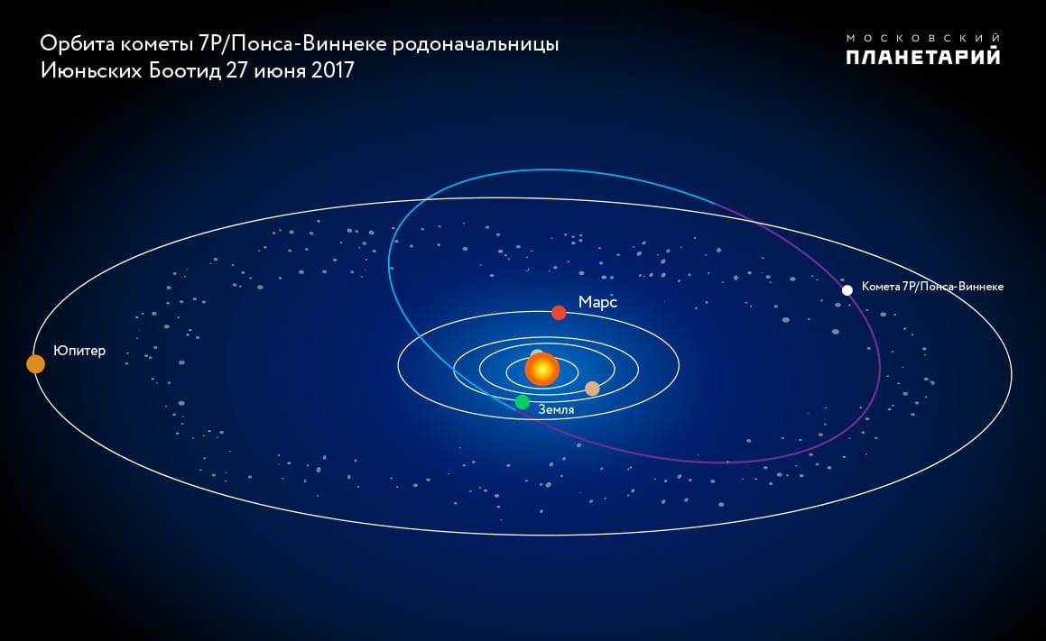 Июньские Боотиды наблюдаются ежегодно с 22 июня по 2 июля, показывая свой максимум 27 июня. Своим появлением Июньские Боотиды обязаны короткопериодической комете 7P/Понса-Виннеке. Земля в этот период проходит вблизи орбиты кометы, и мелкие частицы кометного вещества, устремляясь к поверхности нашей планеты, сгорают в атмосфере, даря наблюдателям явление метеоров, или метеорного дождя.