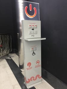 В просторном холле стоят удобные скамейки с электророзетками, с помощью которых можно подзарядить свои гаджеты. Имеется и стойка с разъемами для мобильных телефонов и планшетов, расположенная при входе в вестибюль станции.