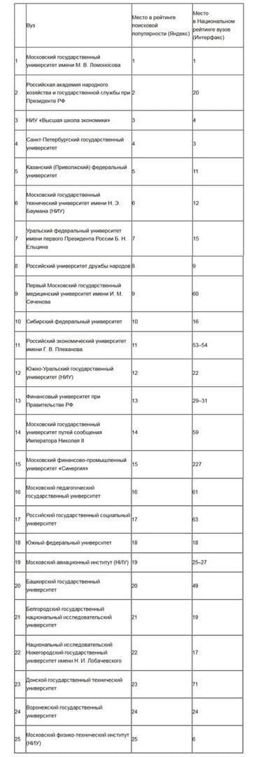 Яндекс составил рейтинг поисковой популярности вузов. В него вошли 264 вуза из Национального рейтинга российских университетов, опубликованного Интерфаксом в начале лета. Чем выше вуз находится в рейтинге Яндекса, тем больше про него спрашивают пользователи.