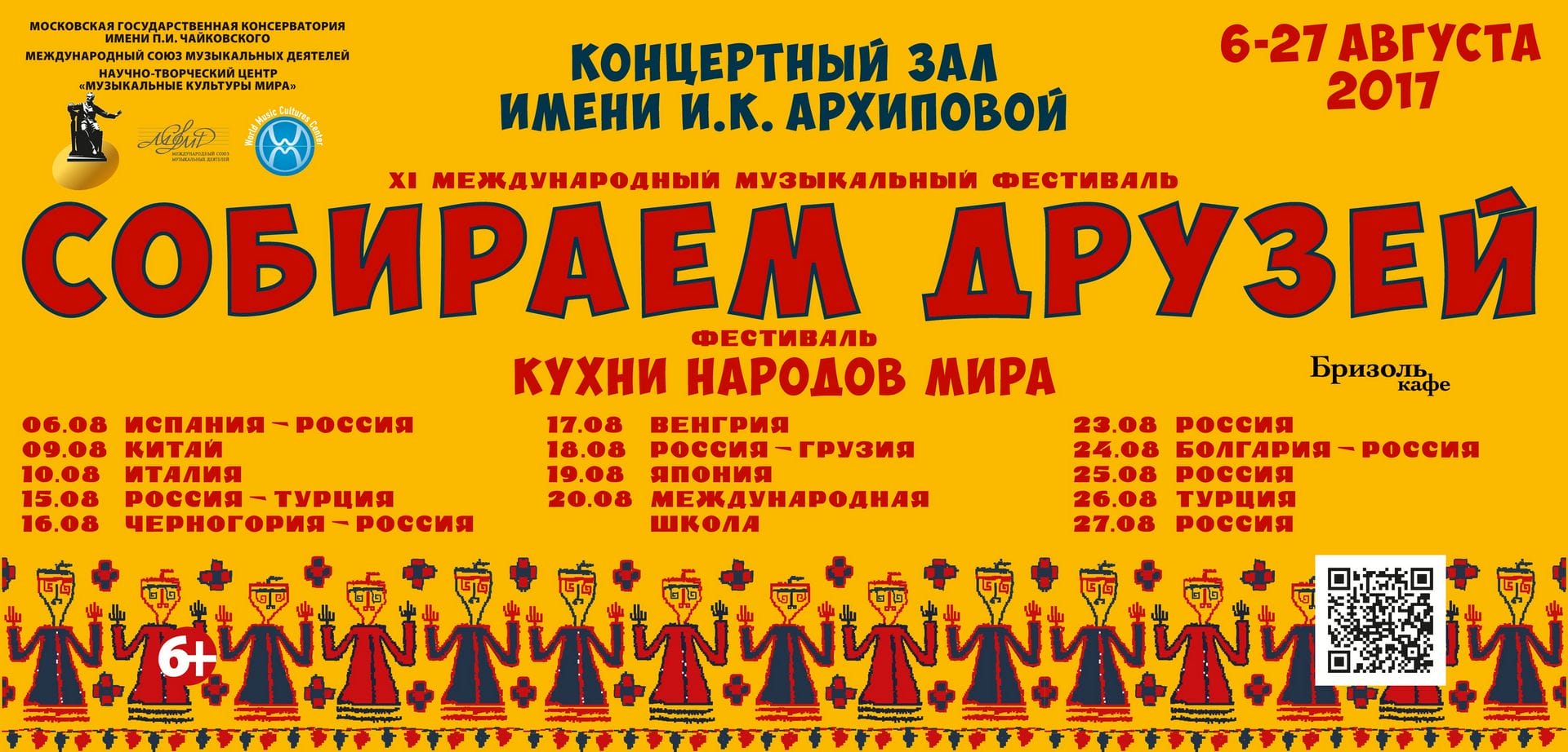 XI Международный музыкальный фестиваль «Собираем друзей» предлагает своим слушателям четырнадцать разнообразных концертов. Скрипичные сонаты Моцарта, Брамса и Франка в исполнении молодых «звёзд» Испании и России Аны-Марии Бадиа-Никифоровой и Александра Шайкина (6 августа) устанавливают высокий стандарт программ европейской классики, составляющих основу фестиваля. При этом форматы и концепции концертов данного сегмента различны: здесь и сольные выступления пианистов (Бруно-Франческо Леоне, Италия, 10 августа; Людмила Духан, Россия, 25 августа), и фортепианный дуэт Дениса Чефанова и Виктора Лядова 23 августа, и российско-грузинская группа учителей (Наталия Трулль, Нино Катамадзе) и учеников (Саломе Модебадзе, Сандро Цикоридзе; 18 августа), и камерные дуэты (скрипка и фортепиано: Павел Минев, Болгария, Максим Кулагин, Россия, 24 августа; флейта и фортепиано: Халит Тургай, Лилиан Тонелла, Турция), и фортепианный квартет «Anno Domini», празднующий свой небольшой юбилей проектом с интересным видеорядом (27 августа). В это звуковое полотно, пронизанное романтическими идеалами европейской философии, причудливо вплетаются: изысканное очарование китайской классической музыки («Капли белой росы», 9 августа); неповторимое своеобразие венгерской скрипки (17 августа); песни прекрасной Черногории, рождённые её таинственными пещерами и самой Адриатикой («Благо Црне Горе», 16 августа); путешествие по «музыкальным страницам» Ближнего и Среднего Востока разных эпох («От Константинополя до Стамбула», 15 августа); раритетная японская традиция театральной песни дзиута и танца дзиута-маи (19 августа).