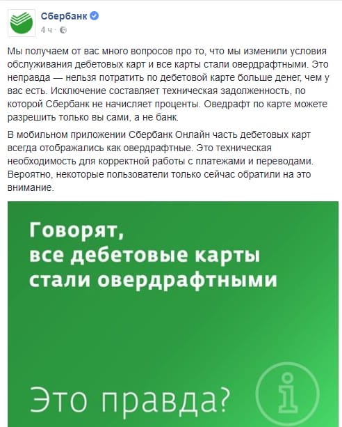 «Сбербанк России массово поменял статус дебетовых карт в мобильном банке с «дебетовая» на «овердрафтная», – сообщает «Интерфакс».