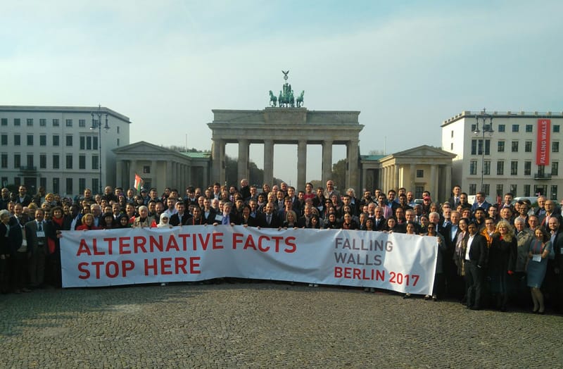 Несколько дней назад у знаменитых Бранденбургских ворот Берлина можно было наблюдать необычную фотосъемку: люди разного возраста собрались большой группой перед камерой, придерживая руками огромный плакат со словами «Alternative facts stop here!» – «Здесь нет места альтернативным фактам!». Участниками этой символической акции стали более 200 видных ученых из разных стран, которые приехали на традиционную конференцию, посвященную падению Берлинской стены.