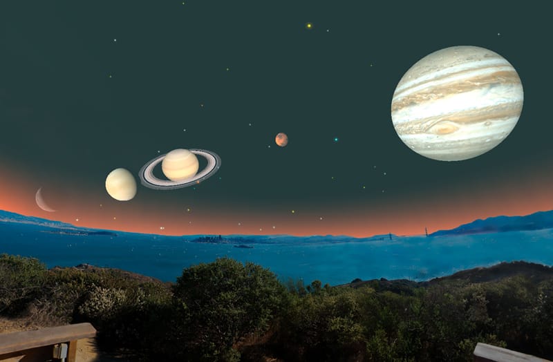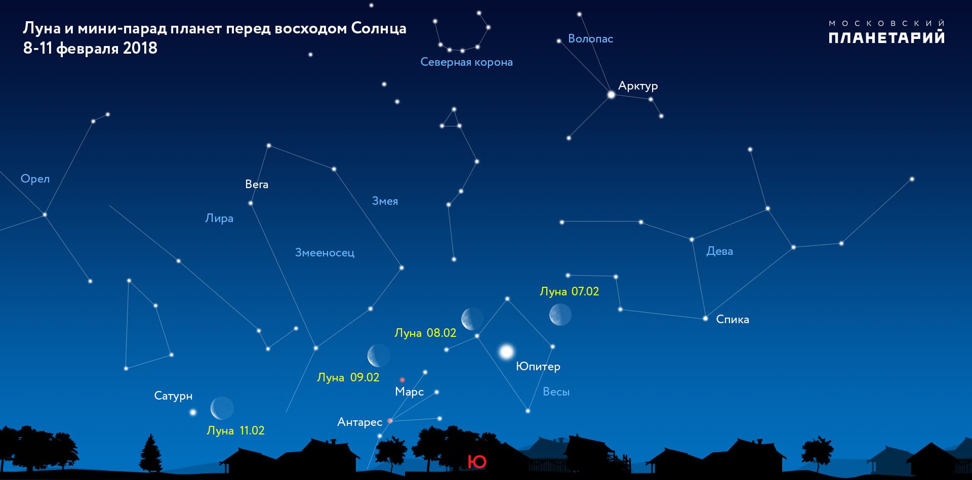 Красивое зрелище ожидает россиян перед восходом Солнца до конца недели. С начала февраля три планеты Сатурн, Марс и Юпитер выстроились над южным горизонтом почти в одну линию, образуя утренний мини-парад планет, который можно наблюдать каждое утро до восхода Солнца. Все три планеты наблюдаются в одном секторе неба. Высоко на юге виден Юпитер. Восточнее его Марс, и совсем низко над юго-восточным горизонтом после 6.30 мск восходит Сатурн. Недалеко от Марса ближе к горизонту ярко сияет Антарес (яркая звезда в созвездии Скорпиона), добавляя в этот мини-парад и свое красноватое сияние.