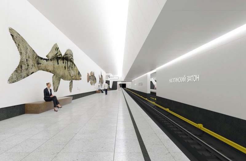 Так, мастерская «za bor» представила станцию «Нагатинский затон» в виде музея, посвященного обитателям рек Москвы: ее стены будут украшать гранитные мозаики с изображением 12-и видов рыб.