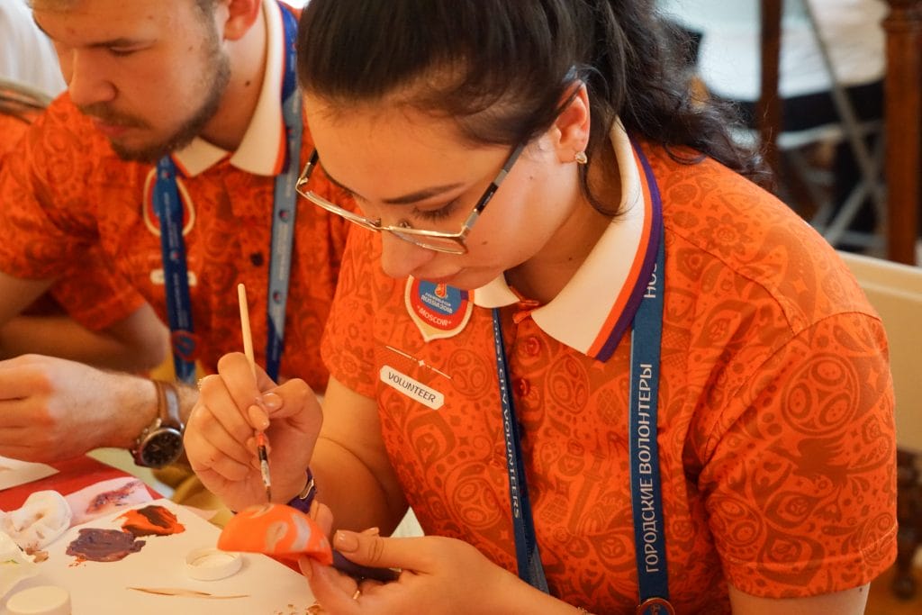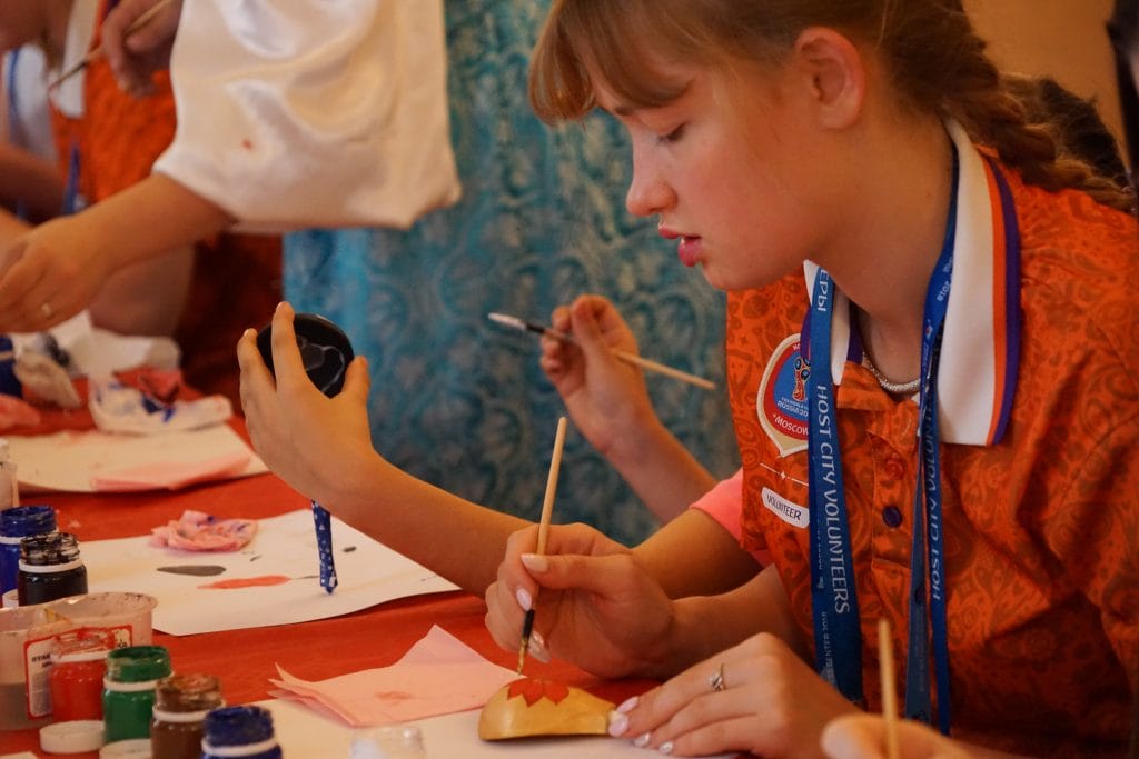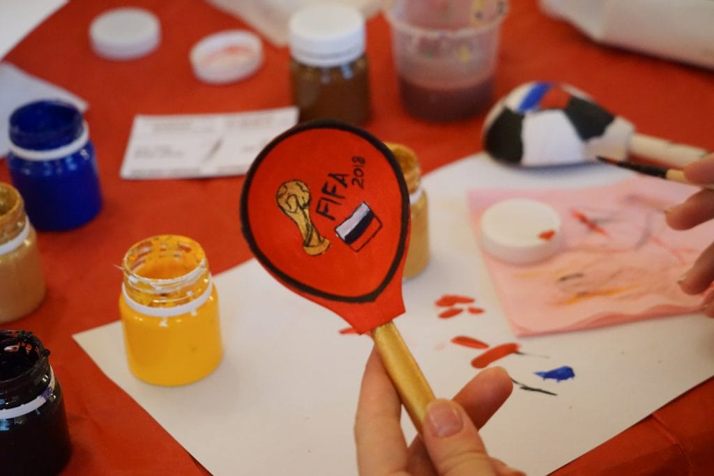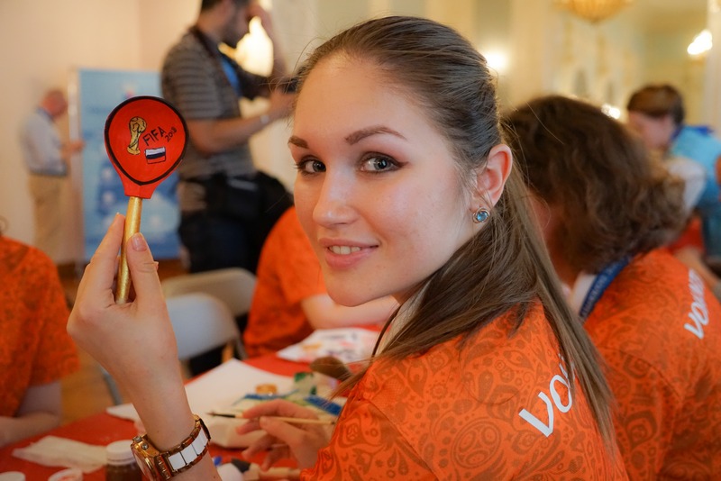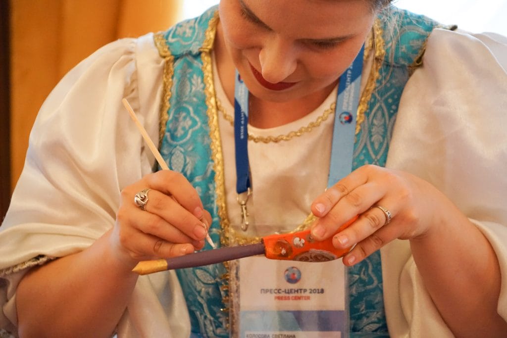 21 июня на площадке футбольного пресс-центра в Доме союзов прошли мастер-классы «Роспись деревянной ложки в технике хохлома». Как рассказала художник музея русской игрушки Измайловского кремля Светлана Колосова, роспись ложек в основном была в стиле хохломы, но свобода творчества тоже приветствовалась. Так как черный цвет символизирует землю, то на ложках рисовали все, что растет на земле: ягоды, листья, цветочки, травинки. Основные цвета узоров – черный, красный и золотой, есть вкрапления зеленого, коричневого и других. Впрочем, рисовали все, что хотели – флаги, символы, гербы и многое другое. С большим удовольствием расписали ложки и иностранцы – гости столицы на время Чемпионата Мира по футболу 2018, которые повезут свои «произведения искусства» на родину.