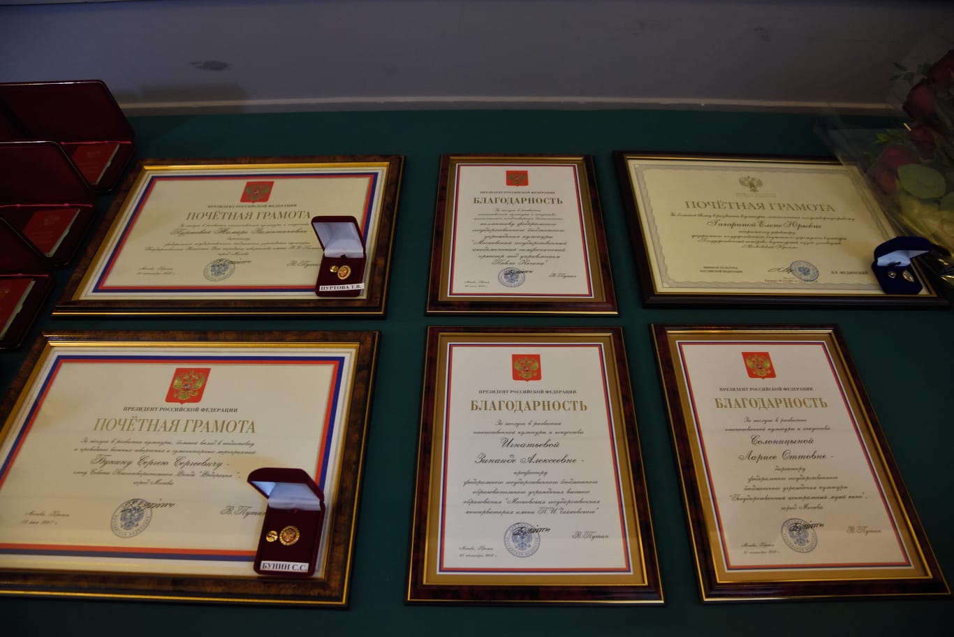 Почетные грамоты Президента России вручены члену Совета Благотворительного фонда «Федерация Сергею Бунину и директору Государственного российского дома народного творчества им. Поленова Тамаре Пуртовой. Благодарностью Президента Российской Федерации удостоены профессор кафедры Московской государственной консерватории имени Чайковского Зинаида Игнатьева и директор Государственного центрального музея кино Лариса Солоницына.