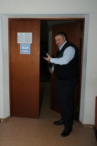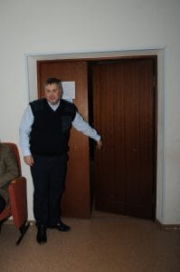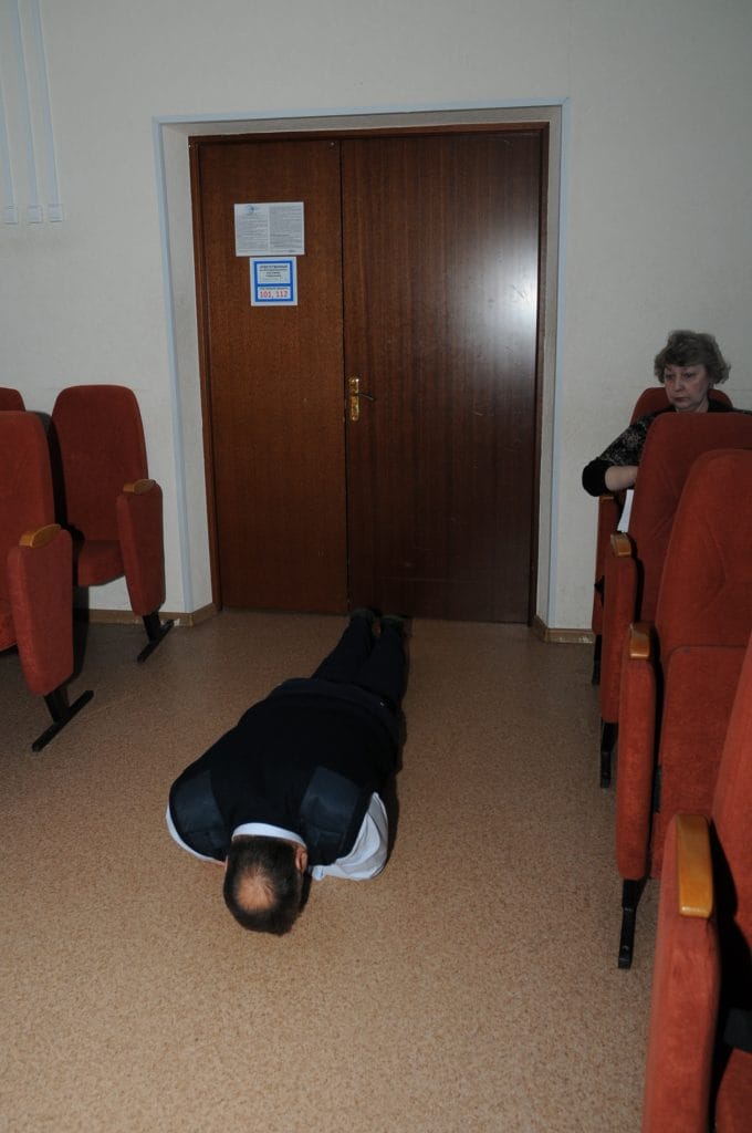 Допустим, вы все-таки хотите выйти. Как надо открывать дверь? Сначала, демонстрирует Александр Дергачев, дверь надо проверить — провести вдоль ее короба рукой, не слишком ли горячо. Потом открыть дверь… как именно? Лектор открывает дверь, как обычно мы это делаем, оказывается перед раскрытым проемом и разводит руками: «Все, меня обожгло». Затем он встает со стороны дверной ручки и осторожно приоткрывает дверь, находясь под прикрытием стены.