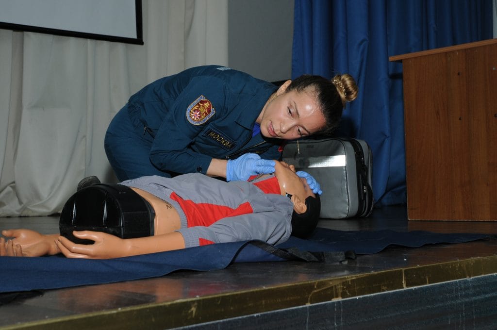 Студенты активно задавали вопросы. Можно ли потушить огонь в квартире пачкой соды? Легко ли пользоваться огнетушителем? А один парень задал вопрос: допустим, я эвакуировался сам и вытащил друга, который ударился в панику, повредился и вообще без сознания. Что с ним делать? У спасателей на этот вопрос был заготовлен развернутый ответ с демонстрацией. На сцену лег парень и стал изображать, что ему плохо, а Марина Хабарова опустилась рядом на колени, деловито натянула на руки перчатки и начала рассказывать.