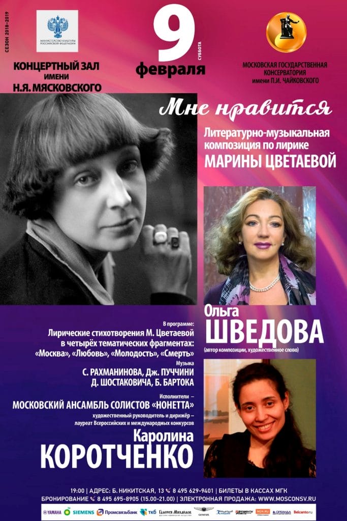 9 февраля в Концертном зале им. Н. Мясковского Московской консерватории (Б. Никитская, 13) состоится вечер, посвященный лирике Марины Цветаевой. Будет представлена литературно-музыкальная композиция «Мне нравится…» в четырех частях: «Москва», «Любовь», «Молодость», «Смерть». Прозвучат стихи поэтессы разных лет, которые исполнит автор композиции Ольга Шведова. Наиболее известные стихи Цветаевой прозвучат наравне с мало исполняемыми произведениями поэта, создавая эффект узнавания и познания творчества поэта. Каждое музыкальное произведение духовно и эмоционально продолжает тему поэзии Марины Цветаевой. Наряду со знакомыми, всеми любимыми «Элегией» Рахманинова и квинтетом Шостаковича прозвучат и малоизвестные русскому слушателю «Хризантемы» Пуччини, фрагменты Симфонии «Кошут» Бартока.