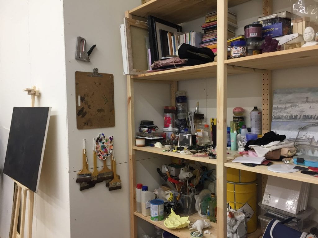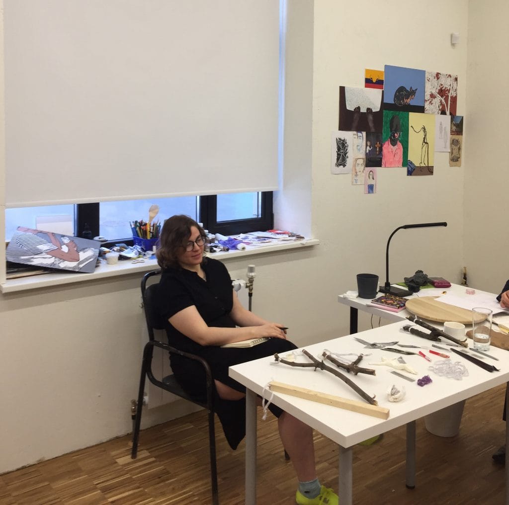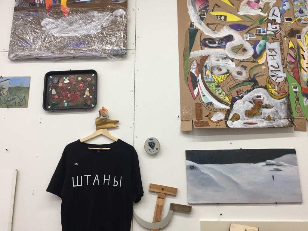 Среди представителей из столицы Екатерина Муромцева, закончившая философский факультет, что, несомненно, сказалось на ее творчестве. В ее мастерской на окнах висят не просто занавески, а настоящие экспериментальные работы. Девушка разрисовала ткань и повесила в качестве штор на большие окна своего временного рабочего пространства.