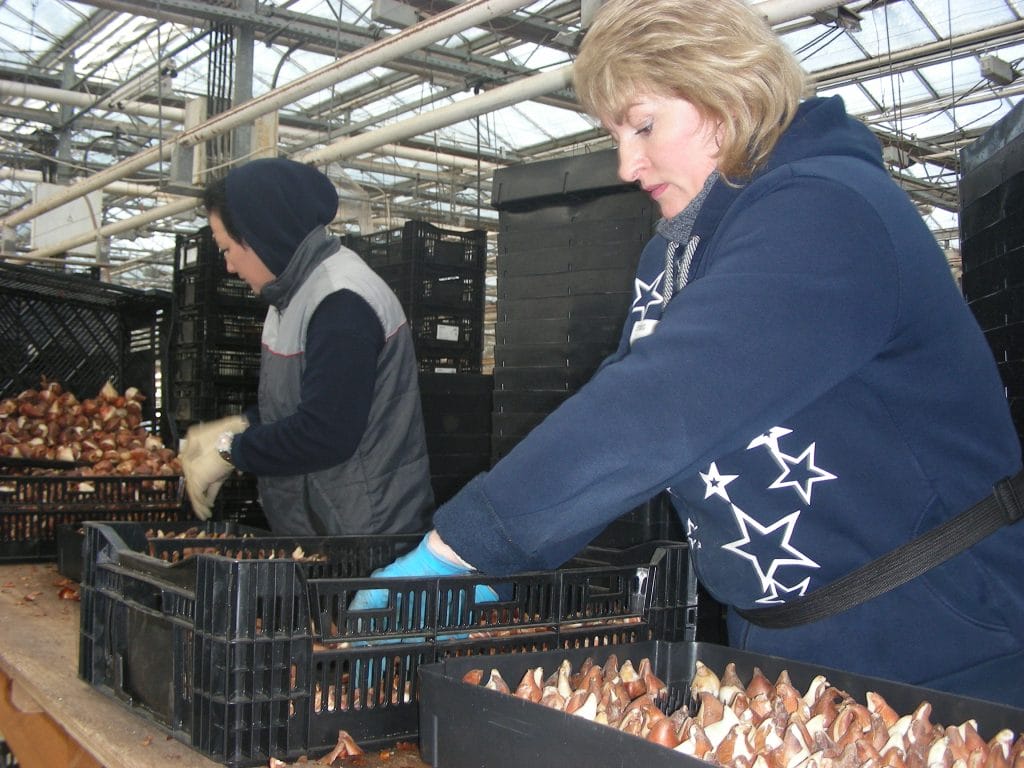 Конечно, за профессиональными рабочими мне не угнаться. У них раз, два — и лоток со 130 луковицами готов. За смену каждая работница в среднем высаживает от 25 до 30 тысяч луковиц тюльпанов. Посадка одной луковицы стоит 9 копеек. Следовательно, за смену можно заработать от 2,5 до 3 тысяч рублей.