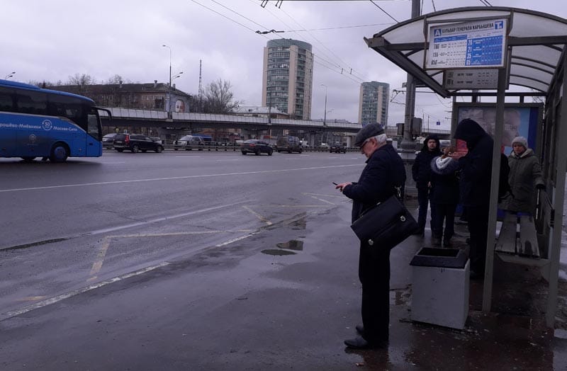 Для начала надо было попасть на другую сторону. Поскольку тут проходит проспект маршала Жукова, эстакада и вообще не менее пяти полос в разные стороны и на разных уровнях, то единственный способ – подземный переход. А из него, заметим, на той стороне два выхода. Возле каждого выхода – остановка. И еще третья остановка в глубине квартала маячит.