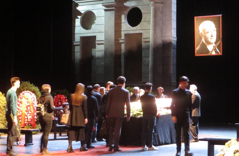На сцену, которой Владимир Этуш отдал почти семьдесят лет, поднимается директор Вахтанговского театра Кирилл Крок, а первыми прощаться проходят студенты Щукинского театрального училища. Звучит голос Этуша: «Наступил наконец день, один из лучших дней моей жизни» … Зрительный зал медленно заполняется людьми, на балконах – представители прессы, фотографы и телевидение.