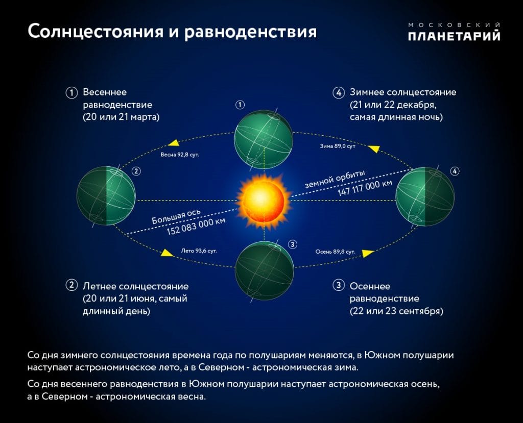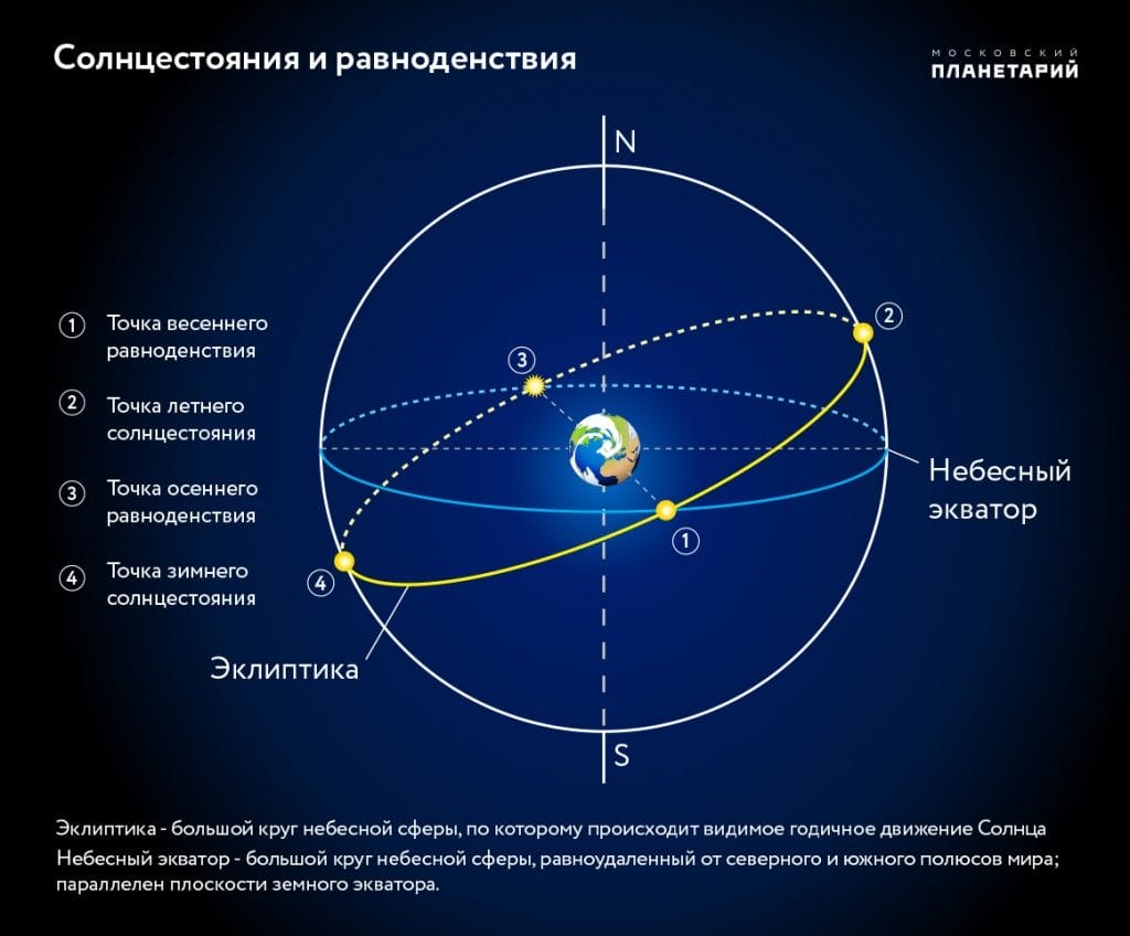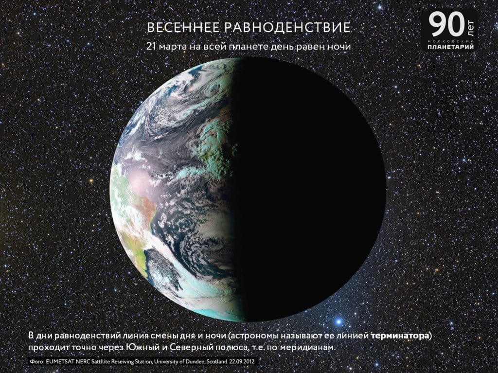 В дни равноденствий Солнце восходит точно на востоке и заходит точно на западе, находясь ровно 12 часов над горизонтом и 12 часов под горизонтом. То есть продолжительность дня и ночи на всей Земле одинакова: день равен ночи. Отсюда и название – равноденствие.