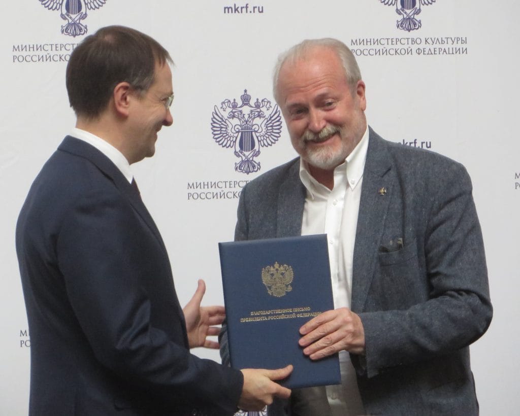 Благодарственные письма президента РФ вручили худруку МХАТ имени Горького Эдуарду Боякову, худруку Малого театра Юлию Соломину, гендиректору Большого театра Владимиру Урину, режиссеру Владимиру Хотиненко, режиссеру Юрию Кара, певцу Денису Майданову, заместителю Министра культуры РФ Николаю Овсиенко, художественному руководителю Русского народного хора имени Пятницкого Александре Пермяковой, актрисе Ксении Лавровой-Глинка и художнику Александру Шилову.