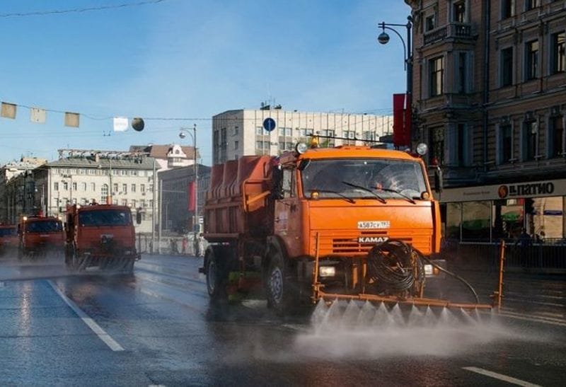 В жаркие дни осуществляется полив газонов и помывка дорог для увлажнения воздуха. Охлаждающее орошение проезжей части помогает уменьшить количество пыли и предотвратить деформацию асфальта.