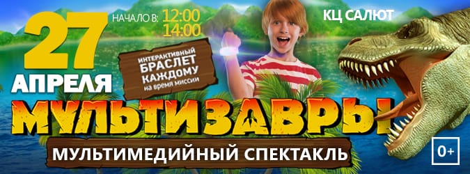27 апреля есть шанс с помощью современных технологий отправиться в незабываемое путешествие в прошлое и лицом к лицу встретиться с настоящими доисторическими ящерами. В культурном центре «Салют» состоится мультимедийное шоу для детей и взрослых «МультиЗавры».