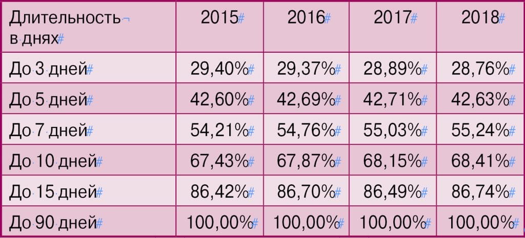 В целом, за четыре года длительность поездок сильно не изменилась, все стабильно как по количеству коротких, так и поездок другой длительности. Подавляющее большинство пассажиров (87%) покупает билет с пребыванием в городе прилета не более 15 дней, а примерно треть из них проводит там не более трех дней. Более 15 дней в городе перед обратным вылетом проводит не более 13% пассажиров.