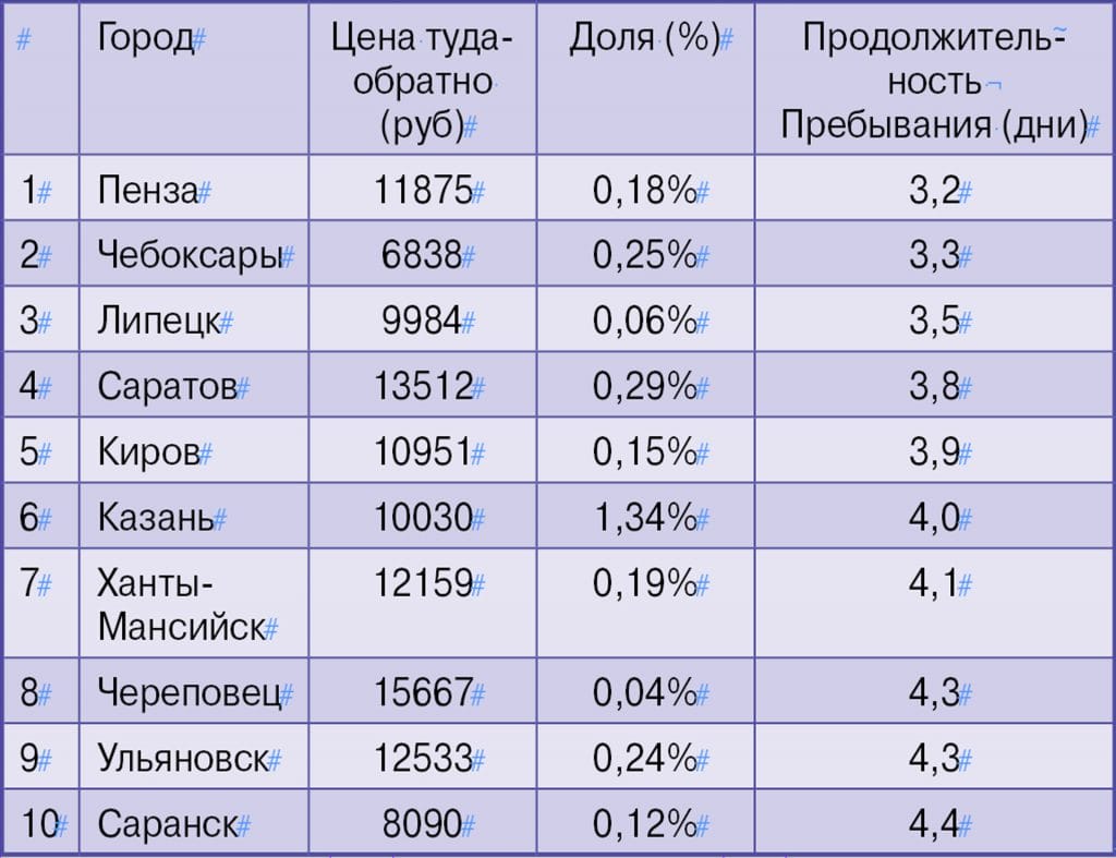Двенадцать и более дней проводят пассажиры в Магадане, Хабаровске, Владивостоке, Петропавловске-Камчатском и Нальчике. В Магадан едут в среднем на 17 дней, что вполне логично, учитывая высокую цену билетов и длительность перелета.