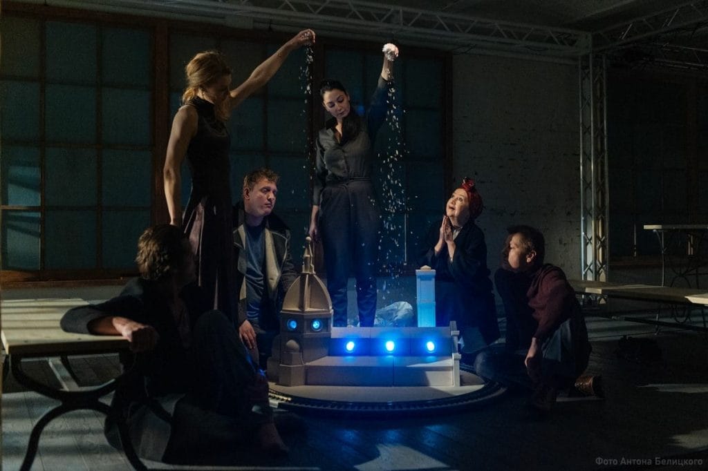 Все это в пространстве белого зала, всего на 30 мест, где ты оказываешься как в одной общей квартире, это усиливает ощущение, что вас пригласили на кухню, сакральное для русского человека место, где обсуждается судьба, жизнь, Бог и самые главные вопросы бытия. Возможность подсмотреть за чьей-то жизнью, посмотреть со стороны на свою. И конечно, как у Чехова обязательно должно висеть ружье, на кухне должна появиться гитара, на которой обязательно споют Окуджаву, чья песня «Господи, дай же ты каждому» и звучит здесь как ответ на главный вопрос спектакля. Как перестать завидовать и начать жить?