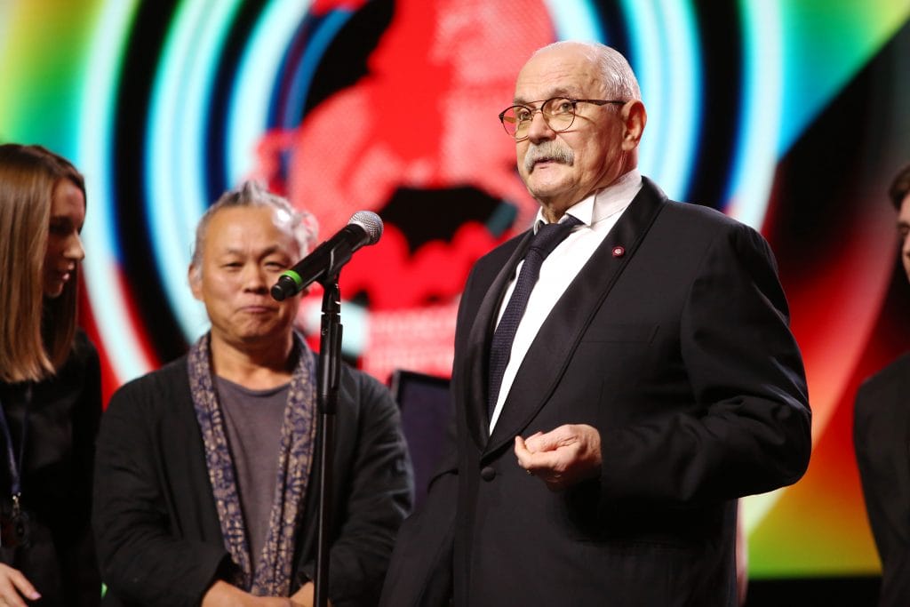 На ведущих тоже сэкономили, на сцене была одна как перст Елизавета Боярская. Она представила жюри и пригласила на сцену председателя жюри. Им в этом году стал южнокрейский режиссер-визионер Ким Ки Дук. Он же был единственной иностранной звездой. Затем на сцену опираясь на костыль вышел Никита Сергеевич Михалков. Ему сделали две операции на бедре и, как он пожаловался на пресс конференции, не может ни сидеть ни лежать, только стоять. Видимо поэтому церемония была такой краткой. Ким Ки Дуку вручили почетный ключ от фестиваля на цепи, а заодно, чтобы два раза не вставать, приз за вклад в кинематограф. Показали нарезку из его фильмов. Программный директор фестиваля, киновед Кирилл Разлогов кратко и популярно обьяснил собравшимся, чем хорош Ким Ки Дук. Потом станцевали хип-хоп под те же частушки акапелла, Лиза Боярская напомнила всем про связь времен и любовь к кинематографу. На том и разошлись.