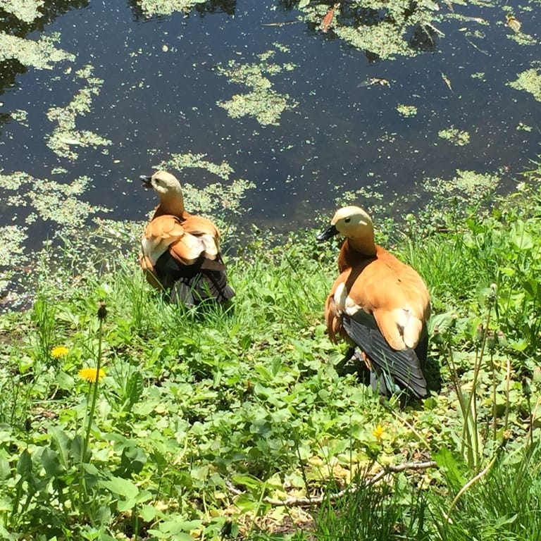 Стоит напомнить, что красные утки гнездятся на крышах высоких зданий неподалеку от сада. В мае, едва вылупившись, птенцы огарей безбоязненно прыгают с большой высоты, а затем следуют за самкой к близлежащему водоему «Аптекарского огорода».