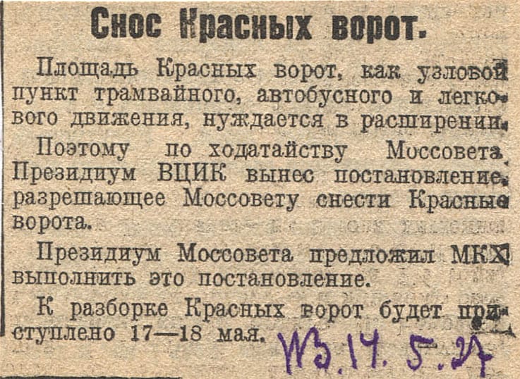 3 июня 1927 года начался снос уникального памятника елизаветинского барокко – Красных ворот, которые, по мнению Моссовета, мешали проезду городского транспорта.