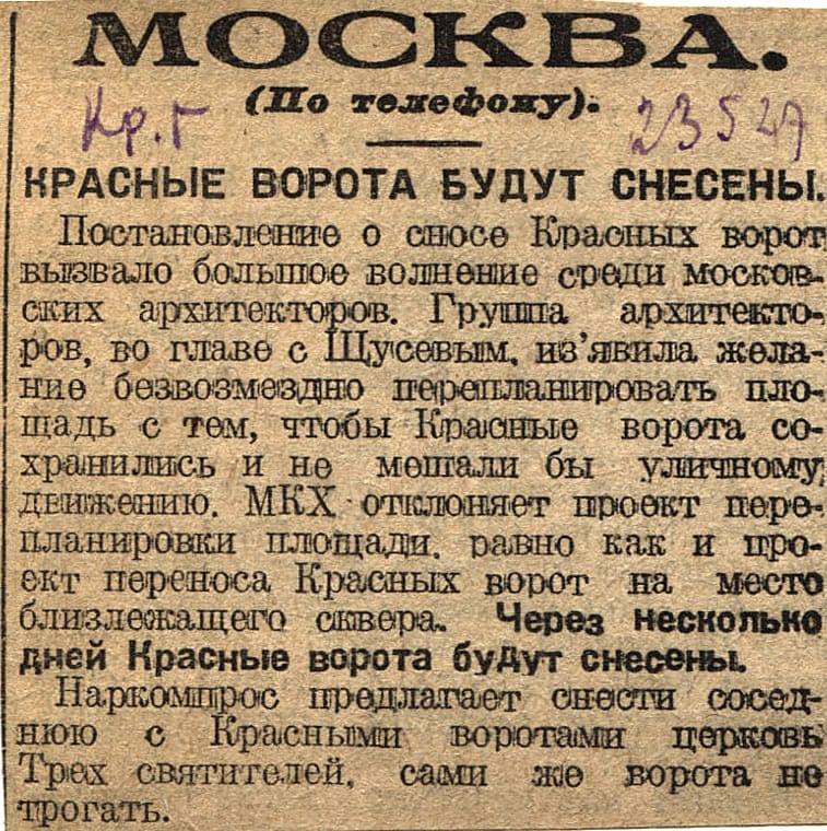 6 апреля Московский отдел народного образования направил в Моссовет просьбу о включении Красных ворот «в список памятников на учете». 16 апреля пришел ответ: «…Надобности о включении Красных ворот в список памятников нет».