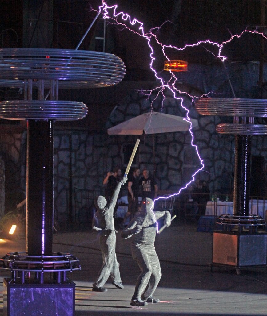 «Шар смелости» – в классическом железном мото-шаре ездят сразу четыре горящих мотоциклиста; «Призрачный гонщик» – полное горение мотоцикла и его всадника; «Огненное танго», и «Огненный оркестр» (этот трюк готовился целый год, в нем дирижер загорался по волшебству ( откроем секрет – с помощью специального дистанционного пульта). В этом году на фестивале представлено уникальное первое выступление самого большого Тесло шоу в России, где актеры «в живую» работают с напряжением 5000000 вольт!