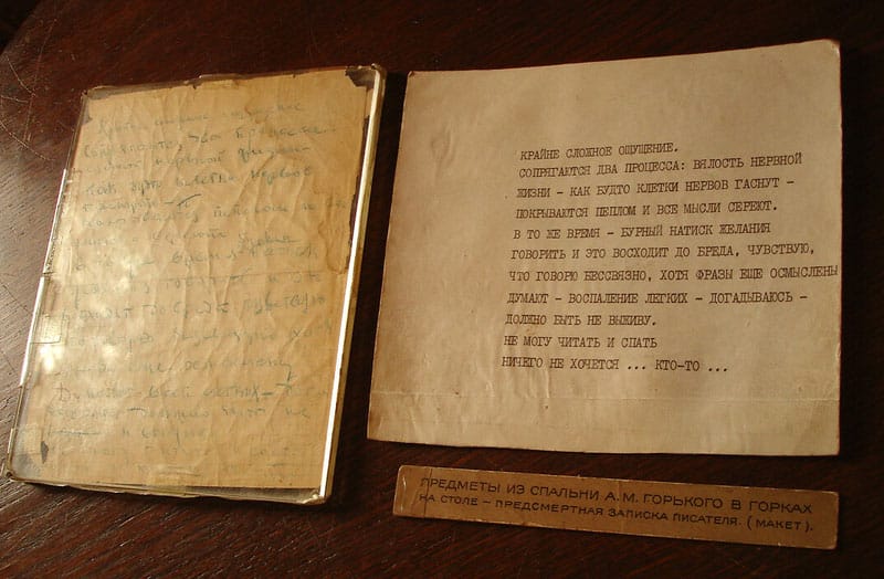 Оригинал этой записки среди прочих экспонатов представлен в экспозиции в музее-квартире писателя в особняке Рябушинского (ул. Малая Никитская 6/2). А последними словами, сказанными устно, по воспоминаниям медицинской сестры Олимпиады Чертковой, постоянно дежурившей у постели больного, стала фраза, обращенная к ней: «А знаешь, я сейчас с Богом спорил. Ух, как спорил!».