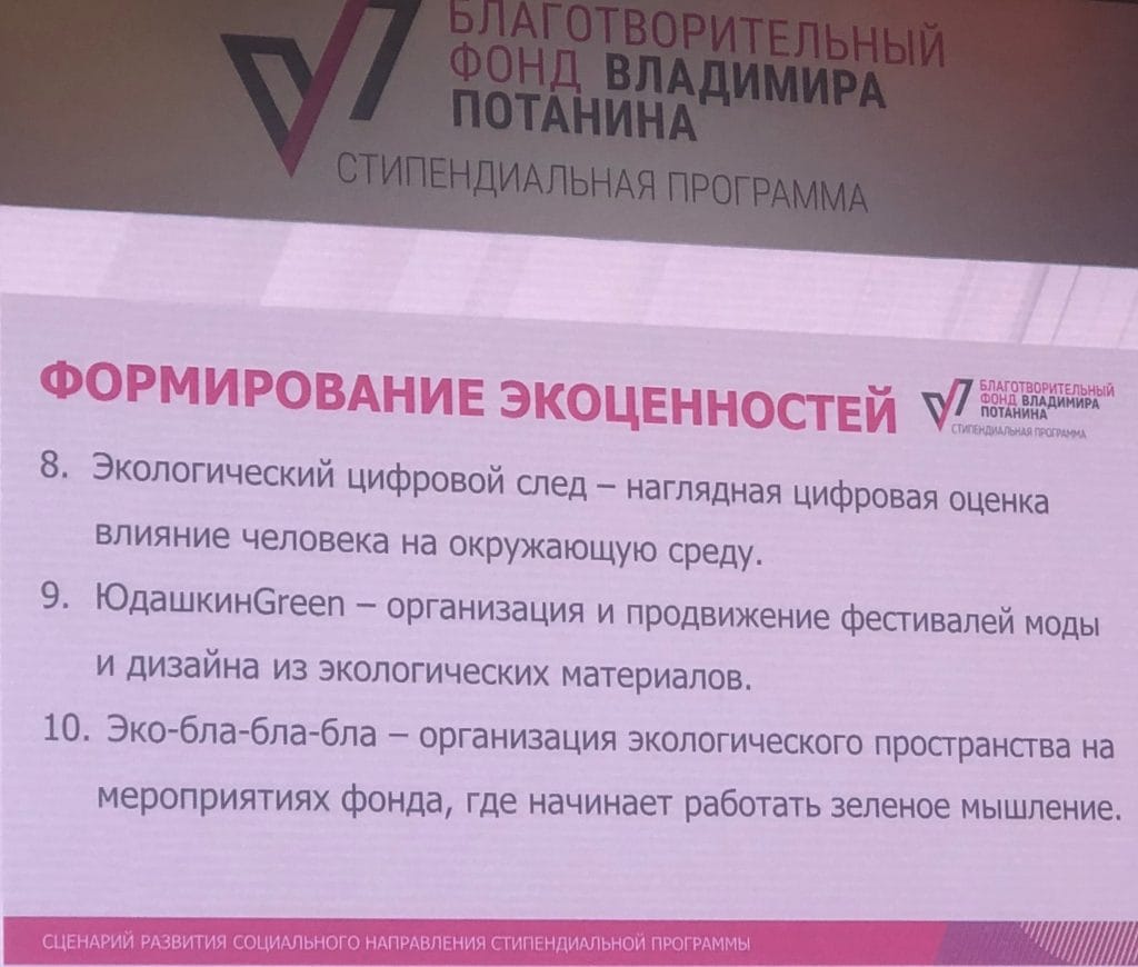 Еще одна группа креативных магистров предложила заниматься здоровьесберегающими технологиями, в частности продвижением фестивалей моды и дизайна из экологических материалов «ЮдашкинGreen» и организация «Эко-бла-бла-бла» – экологического пространства на всех мероприятиях фонда.