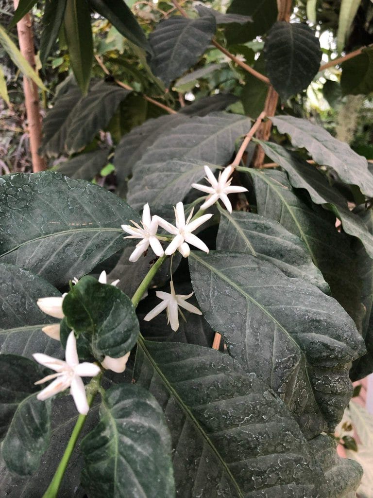 Кофе цветёт маленькими белыми цветками с сильным тропическим ароматом. Плодоносить растение начинает, как правило, на третий-пятый год жизни и делает это вплоть до ста лет. Урожай ожидается зимой.