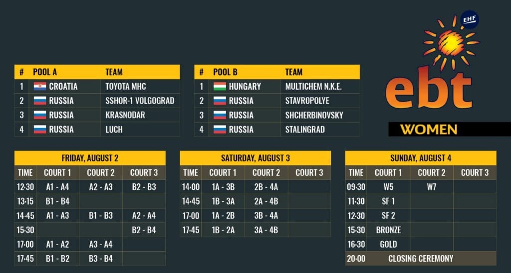 У женщин иностранный десант на московском песке возглавят хорватская «Тойота» и N.K.E. из венгерского города Сентендре. Противостоять им будут российские «Ставрополье», «Волгоград» и «Сталинград», представляющие Волгоград, сборная Краснодарского края, еще одна команда из Краснодарского края «Щербиновский» и московский «Луч».