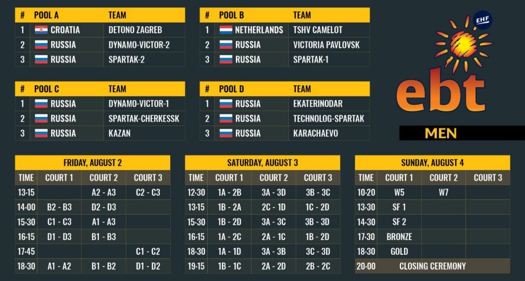 2 августа на трех кортах Центра пляжных видов спорта «Динамо» начнутся игры в группах. Групповой этап определит пары плей-офф, матч стартуют в субботу. Победители первого в истории России этапа Евротура определятся 4 августа.