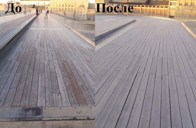 Покрывается древесина террасным маслом Biofa – это оригинальное покрытие, которое наносилось при строительстве Парящего моста. Масло цветное, соответствует серому цвету.