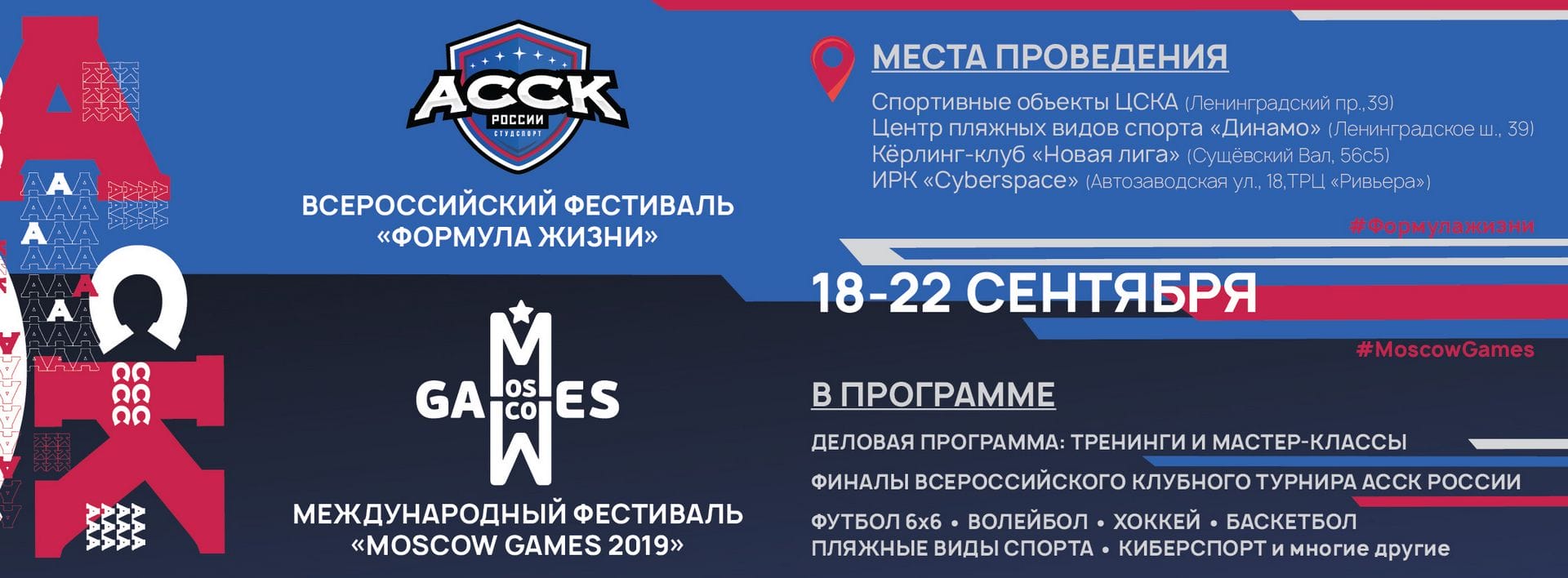 Ассоциация студенческих спортивных клубов (АССК) России определит победителя в противостоянии Восточной и Западной конференций в финале клубного турнира АССК «Восток VS Запад». Помимо этого, АССК России подготовила тренинги и мастер-классы с участием известных спикеров. «Формула жизни» объединит более 3000 активистов из 80 регионов России, пропагандирующих ЗОЖ и готовых дать старт новому этапу развития системы студенческого и молодёжного спорта.