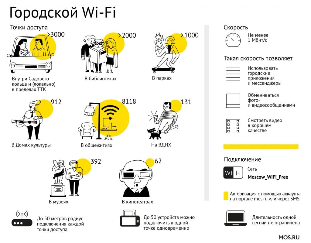 Сейчас количество точек доступа в парках Москвы превышает 1,2 тысячи. Они находятся в общежитиях вузов (10,5 тысячи точек доступа), 334 библиотеках (более 2,1 тысячи), в 200 домах культуры (913 точек доступа), в 16 городских музеях (392 точки доступа), в 13 кинотеатрах сети «Москино» и киноклубе-музее «Эльдар» (62 точки доступа).