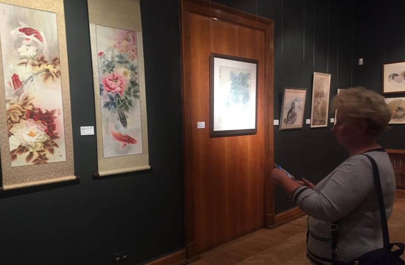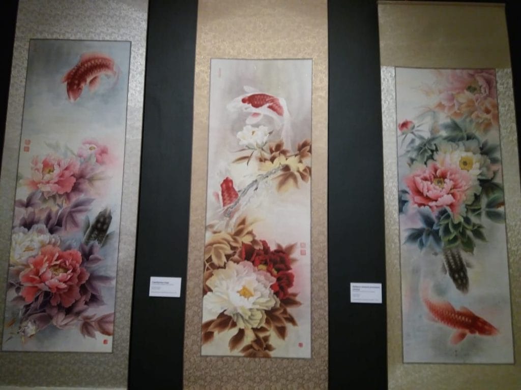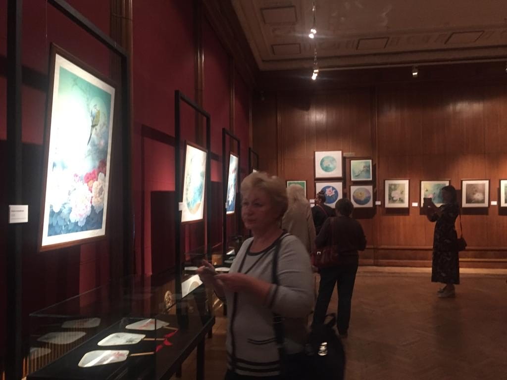 В двух других залах – произведения российских мастеров, работающих в технике «тщательная кисть». Живописцы представили пейзажи, изображения цветов, птиц, животных и рыб. Любимые сюжеты – пионы, лотосы, карпы, все, что имеет благопожелательное значение в китайской живописи. Работы современных художников поражают присутствующих тщательной прорисовкой: усики мотыльков, шерстка животного, нежный румянец щек красавиц или тончайшие цветовые нюансы бутонов цветов, все это виртуозно отражено в каждой работе.