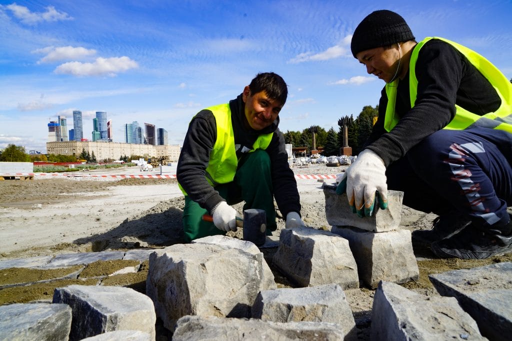 «Люди ходят не только в музейный комплекс, а кто-то ходит к дому по диагонали, к метро «Славянский бульвар», кто-то просто привык здесь гулять. И когда они видят заборы, то у людей, в первую очередь, возникает не очень комфортное ощущение, потом люди понимают. Мы им объясняем, для чего мы это делаем, и это не такое уж продолжительное количество времени, пару месяцев, но зато мы получим уже совсем другую картинку, другой качественный объект. Когда мы планируем свою работу, мы зонируем ее таким образом, чтобы отрабатывать часть площади, а вторая часть чтобы была открыта для пешеходов. Это очень большой объем работ, и при таких сроках качества никто не отменял. У нас работают специалисты Московского государственного строительного университета, которые осуществляют ежедневный сплошной контроль качества, фотофиксацию, проводят лабораторные испытания, плюс технический надзор заказчика – все это также здесь обеспечено. График поставки гранитных элементов распланирован буквально поминутно, мы понимаем, когда придет очередная машина, в какую часть территории она должна подъехать, где разгрузиться».