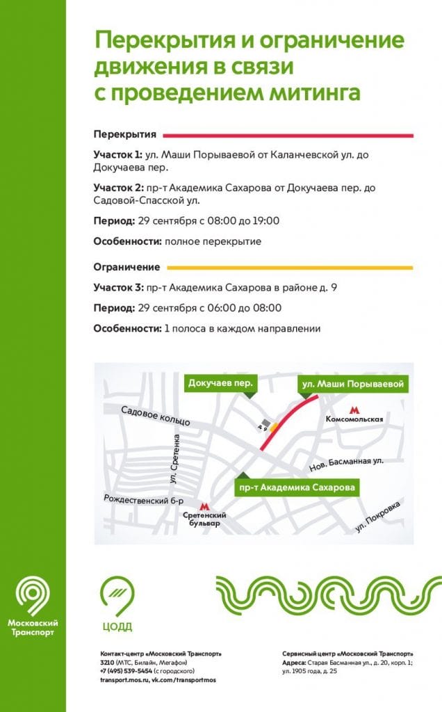 С 08:00 до 19:00 полностью перекроют улицу Маши Порываевой от Каланчевской улицы до Докучаева переулка. Для автомобилистов будет закрыт участок проспекта Сахарова от Докучаева переулка до Садового кольца.
