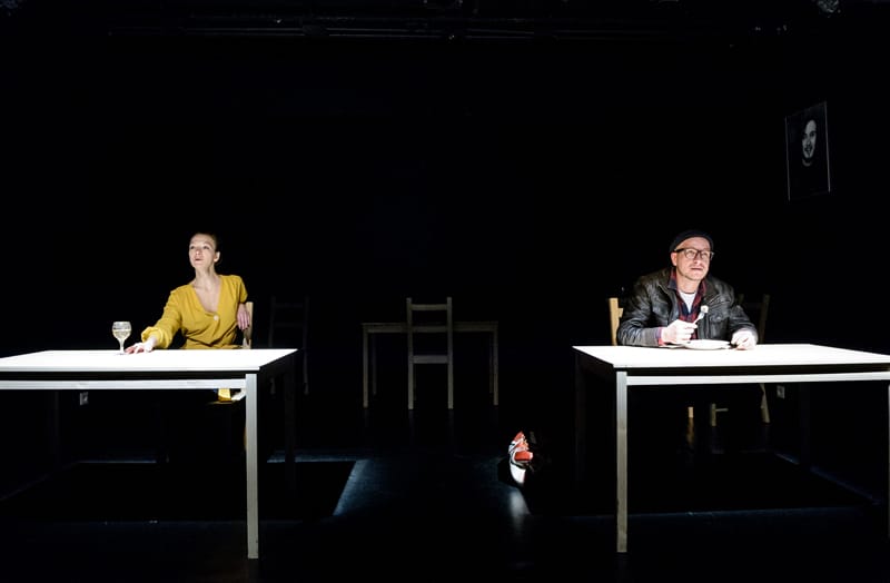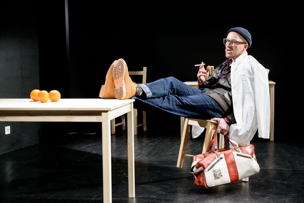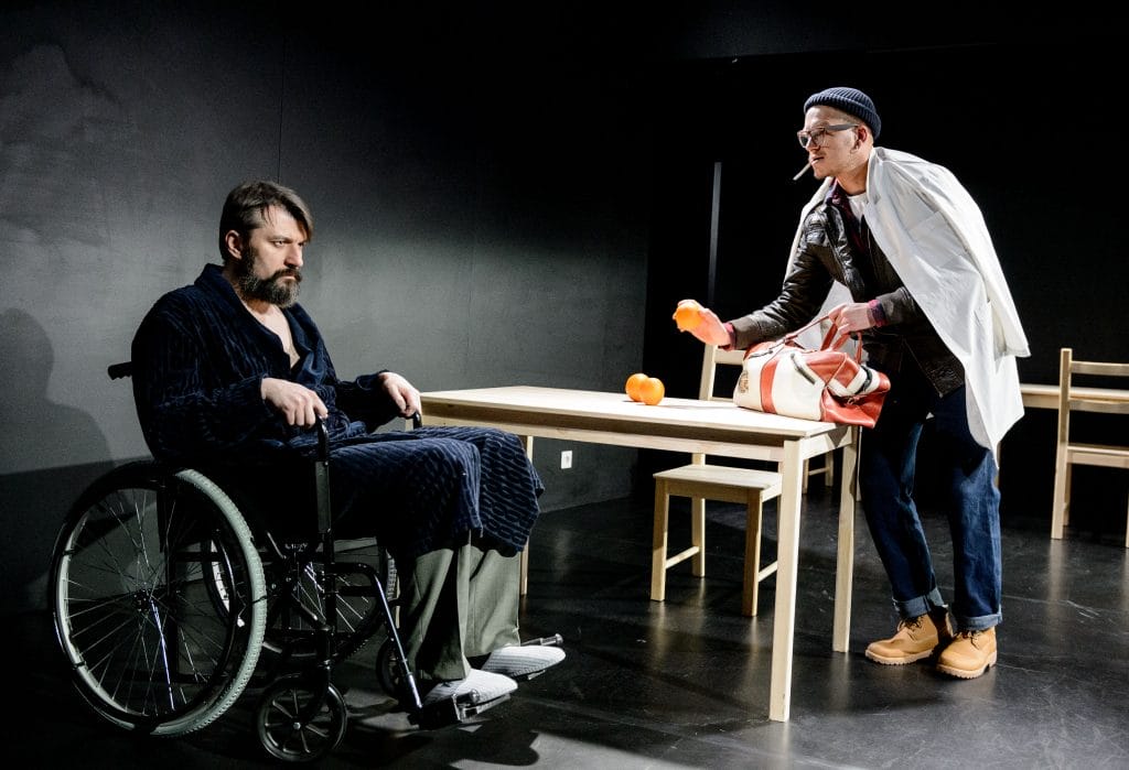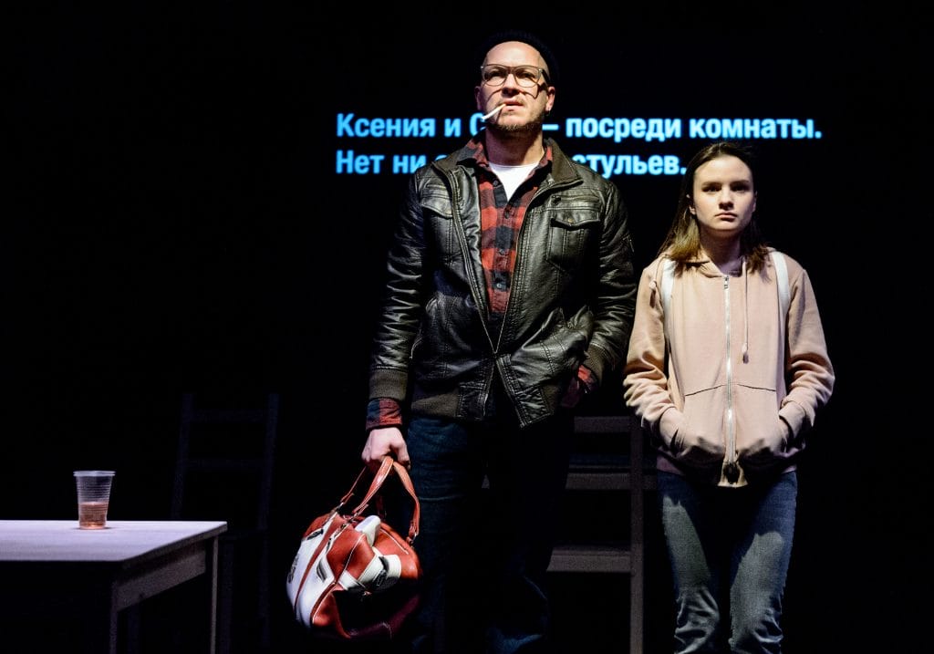 На сцене – черный кабинет, три деревянных стола и несколько стульев, которые есть дом, больница, койки, кафе (сценография Ксении Перетрухиной). Под электронные звуки, напоминающие треск сломанной лампочки (саунддизайнер Дмитрий Власик), зал погружается в повествование о реальности, а точнее об абсурдной реальности нескольких лиц.